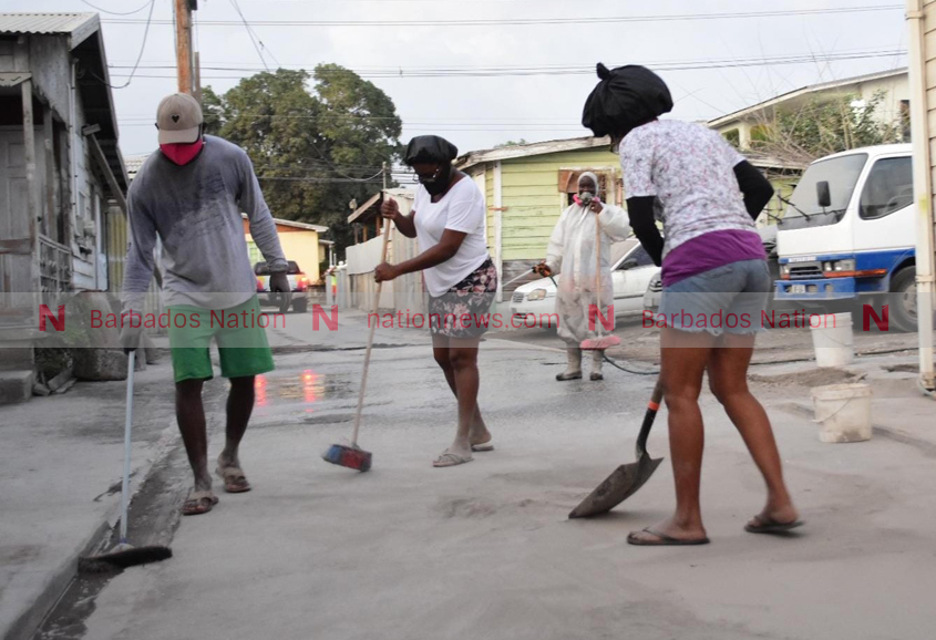 The small community of Dodson Land, Black Rock, St Michael began the task of clearing its street of volcanic ash this evening.