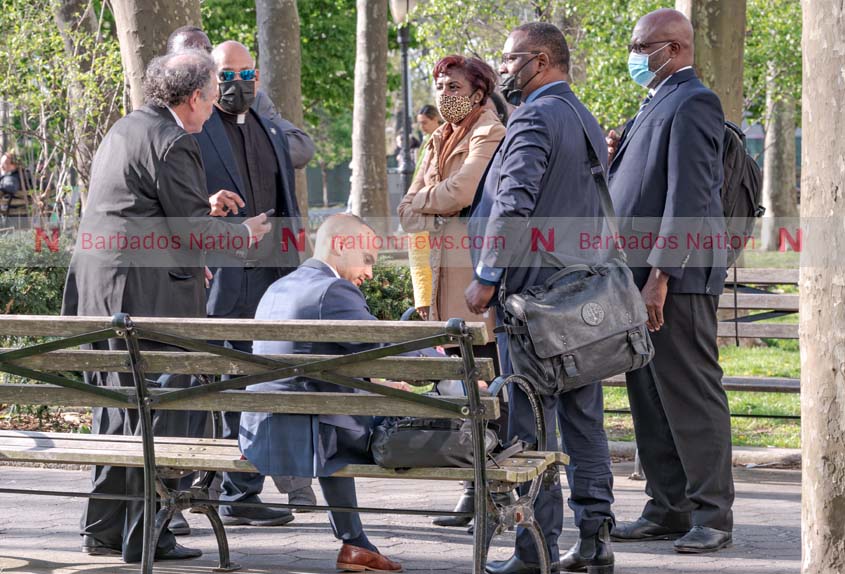 Donville Inniss (centre) arrives at court with his wife Gail and attorney Joel Hirschhorn. (Picture by Maria Bradshaw)