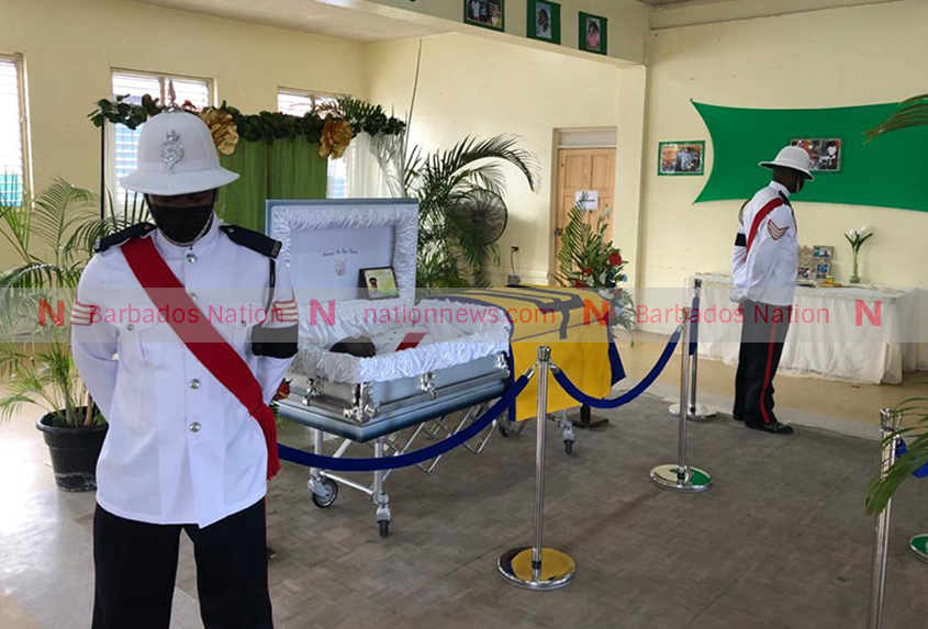The body of slain police officer Newton Lewis was lying in repose at the Police Sports Club, Weymouth, St Michael, from 3 p.m. today, allowing his colleagues, friends and the public to pay their last respects.