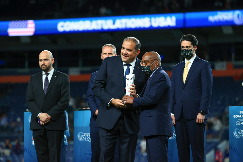 The Bajan Tridents were the winners of League C of the CNL and Harris was handed the silverware by Concacaf president and businessman, Victor Montagliani, after the final between Mexico and United States at the Bronco Stadium in Denver.