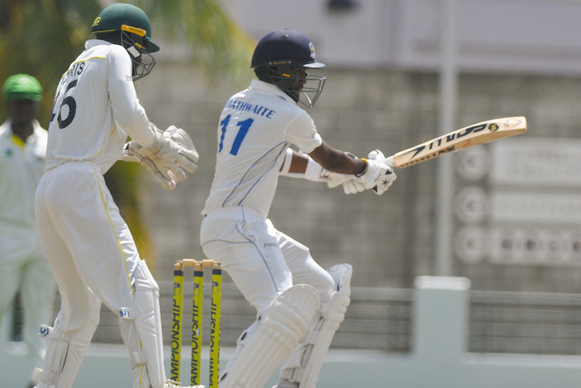 At the interval, Pride captain Kraigg Brathwaite was not out on 181, eyeing his third first-class double hundred, and Jonathan Carter was not out on 32.