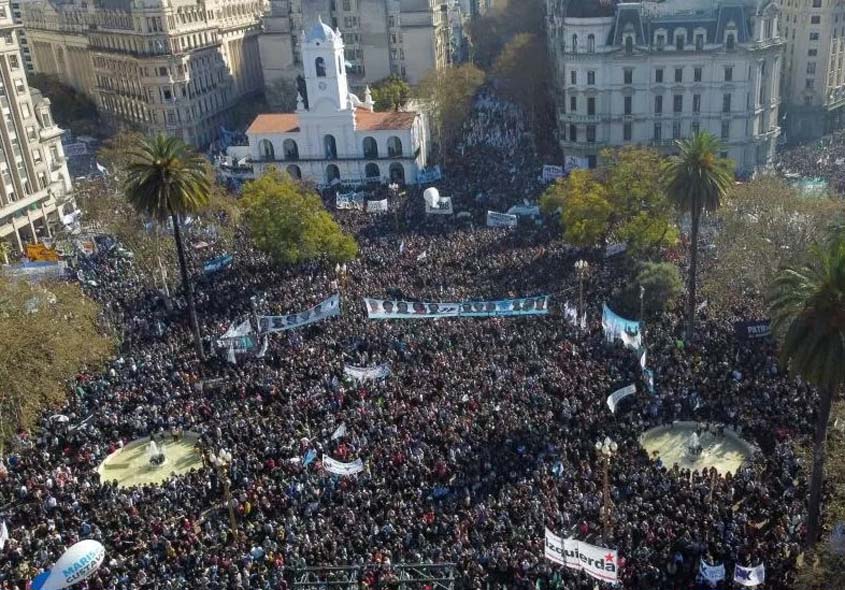 Hundreds of thousands of flag waving supporters descended on the capital’s historic Plaza de Mayo, next to the presidential offices.