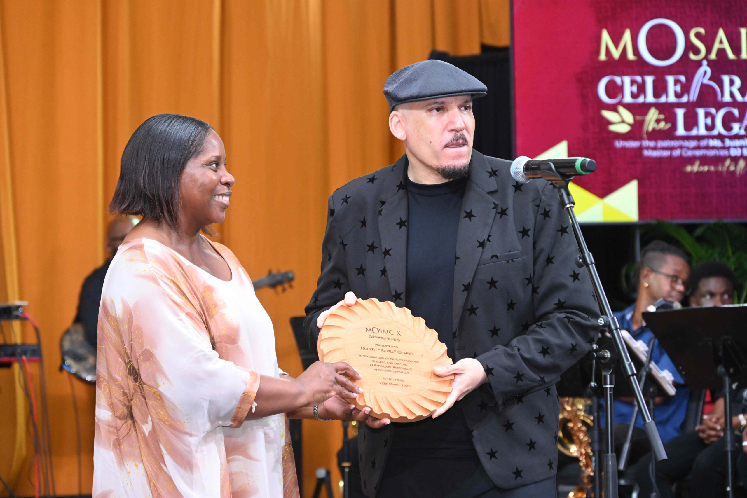 Rupee praised his fellow Barbadians and music colleagues who celebrated his journey by singing his hits as a prelude to him accepting the Mosaic Award from principal of Harrison College Kaylene Kellman-Holder.