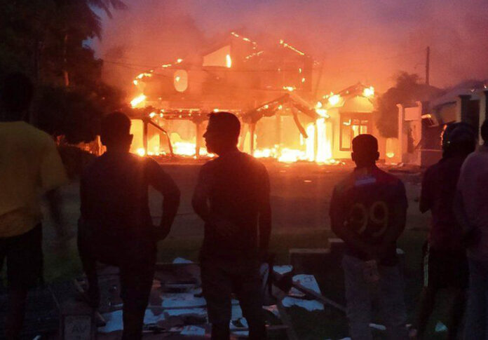 Angry mobs in Sri Lanka have burned down several homes belonging to the ruling Rajapaksas and MPs, following clashes with government supporters.