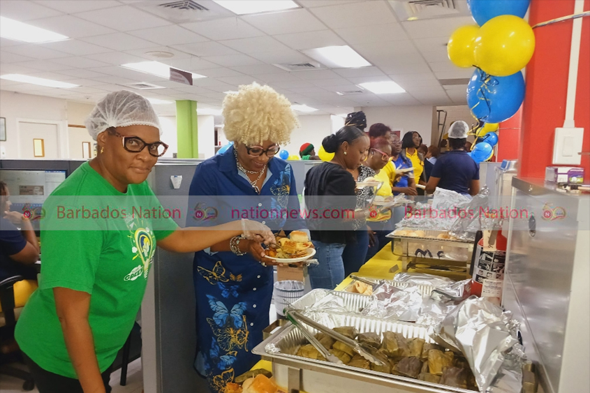 Staff celebrate 58 years of Barbados’ Independence in Nation style at the Harold Hoyte & Fred Gollop Media Complex, Fontabelle, St Michael this morning.
