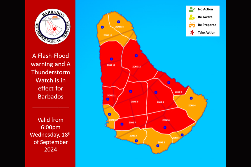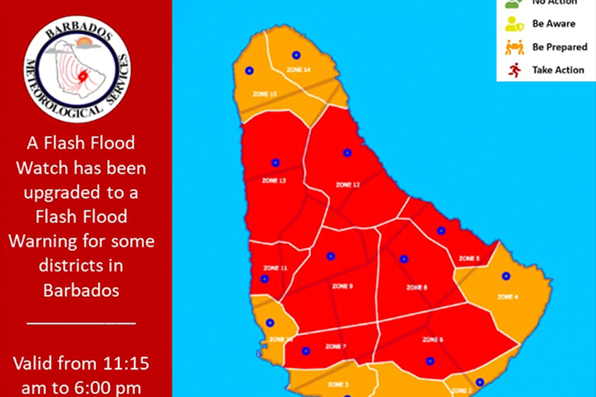 A flash-flood warning is in effect for Barbados until 6 p.m., or sooner if conditions warrant.