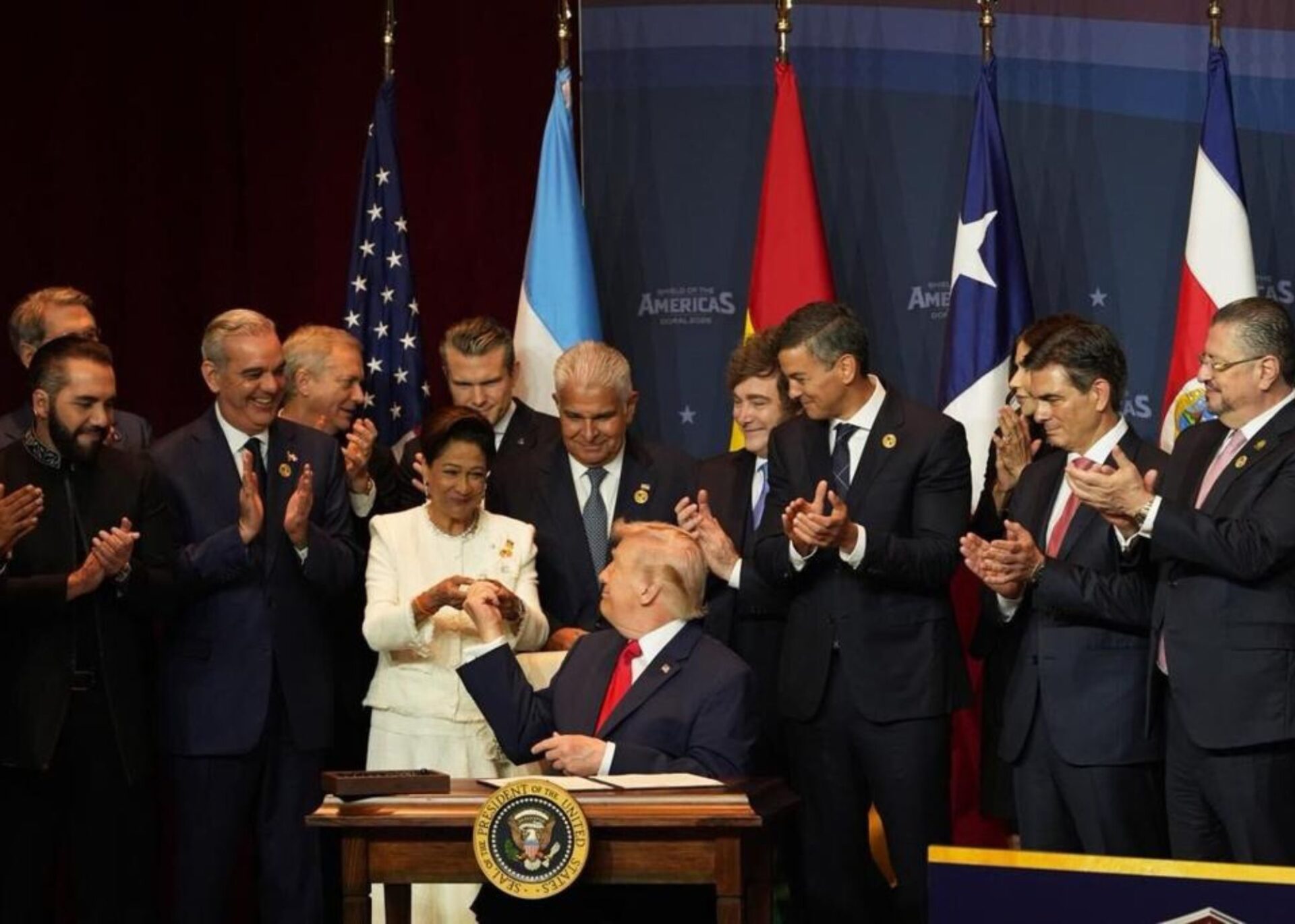 Prime Minister Kamla Persad-Bissessar shared a light moment with Donald Trump during the Summit...