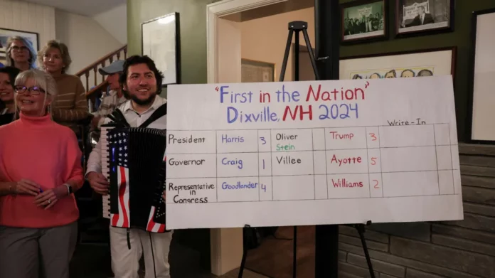 The first result of the 2024 US presidential election - from a tiny township with six residents - has been declared, with a clean split of three votes each for Kamala Harris and Donald Trump.