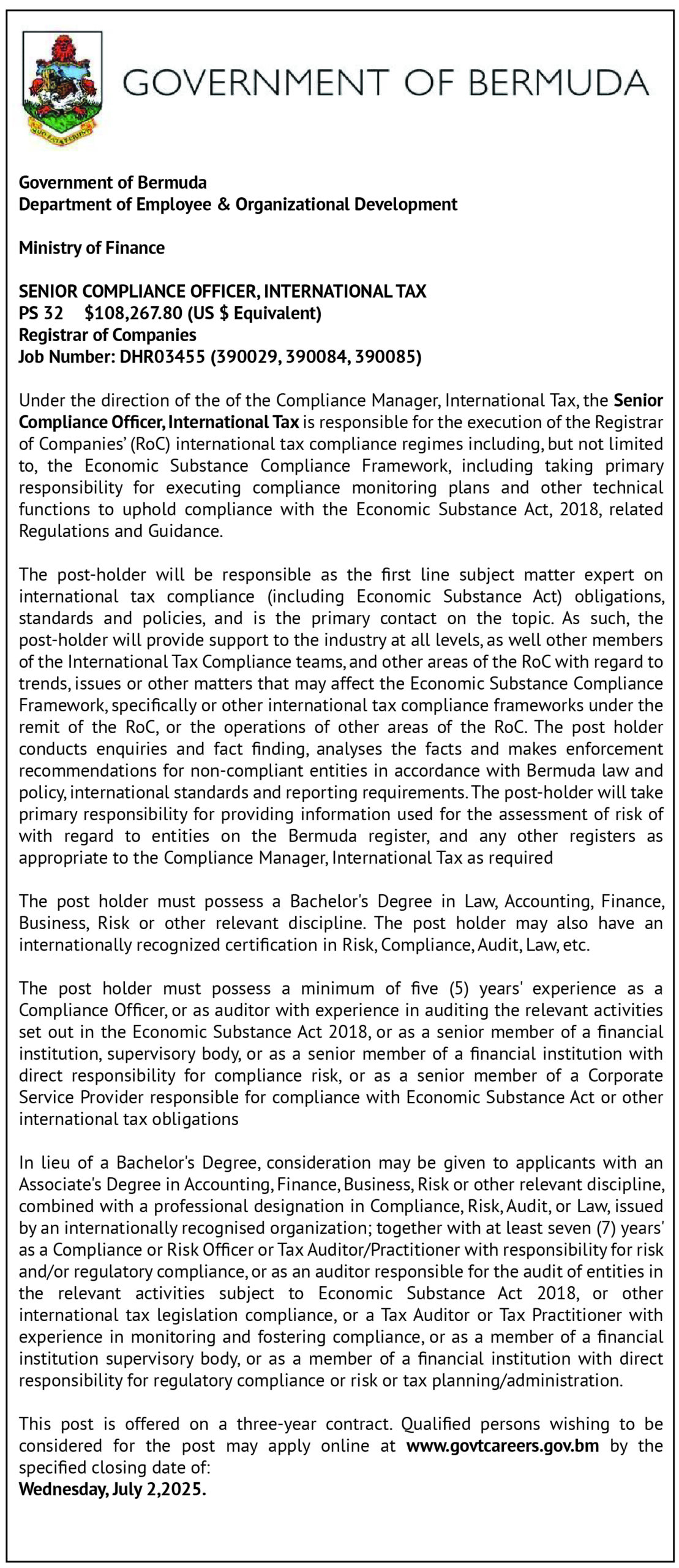 This post is offered on a three-year contract. Qualified persons wishing to be considered for the post may apply online at www.govtcareers.gov.bm by the specified closing date of:
